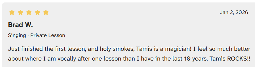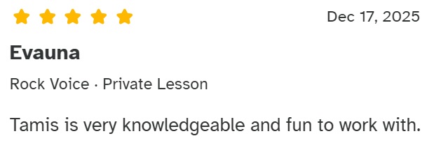 If you really want to learn to sing or improve your singing while having fun, Tamis is the teacher for you! Because of covid-19, I have been home bound for the last year and taking lessons with Tamis both in group and private on line. I finally got to sing for a friend in person and she could not believe how much better I had gotten. It does not matter your style of singing, she has you covered. -Ana
